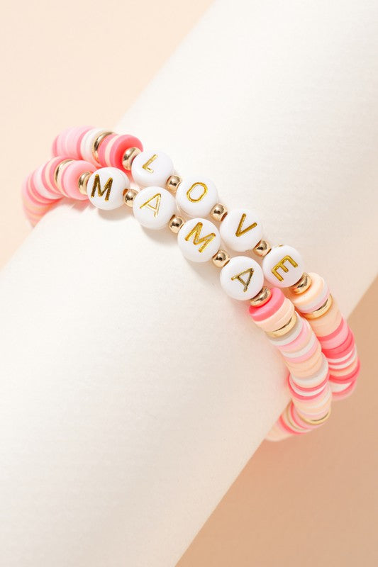 Set of two inspirational rubber beaded stretch bracelets. "LOVE" "MAMA" Material: Zinc, Gold plated, Rubber Beads Lead Compliant, Nickle Free